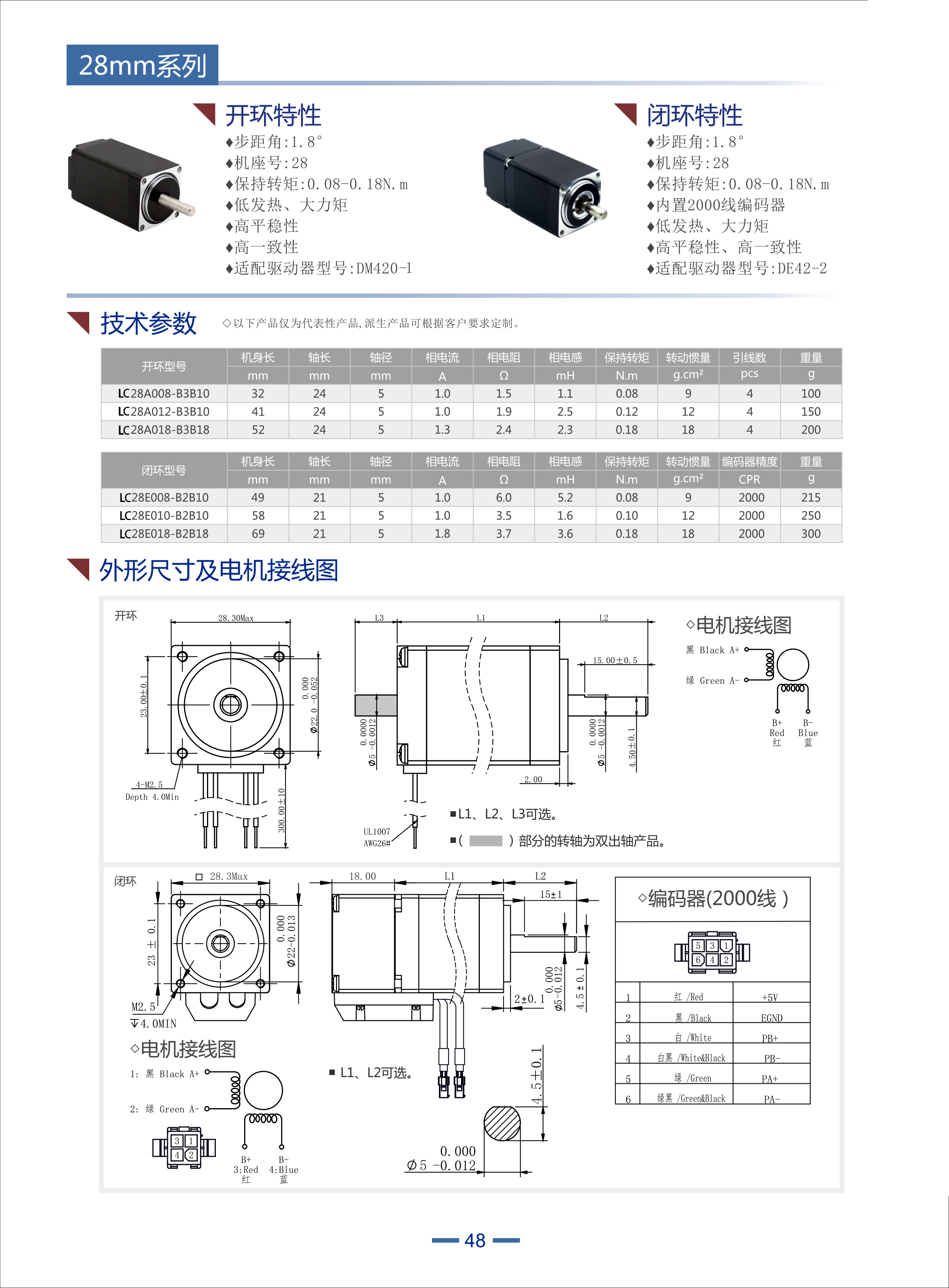 開環(huán)特性 步距角:1.8 機(jī)座號(hào):28 保持轉(zhuǎn)矩:0.08-0.18N.m 低發(fā)熱、大力矩 高平穩(wěn)性 高一致性 適配驅(qū)動(dòng)器型號(hào):DM420-1 | 閉環(huán)特性 步距角:1.8 機(jī)座號(hào):28 保持轉(zhuǎn)矩:0.08-0.18N.m 內(nèi)置2000線編碼器 低發(fā)熱、大力矩 高平穩(wěn)性、高一致性 適配驅(qū)動(dòng)器型號(hào):DE42-2 |