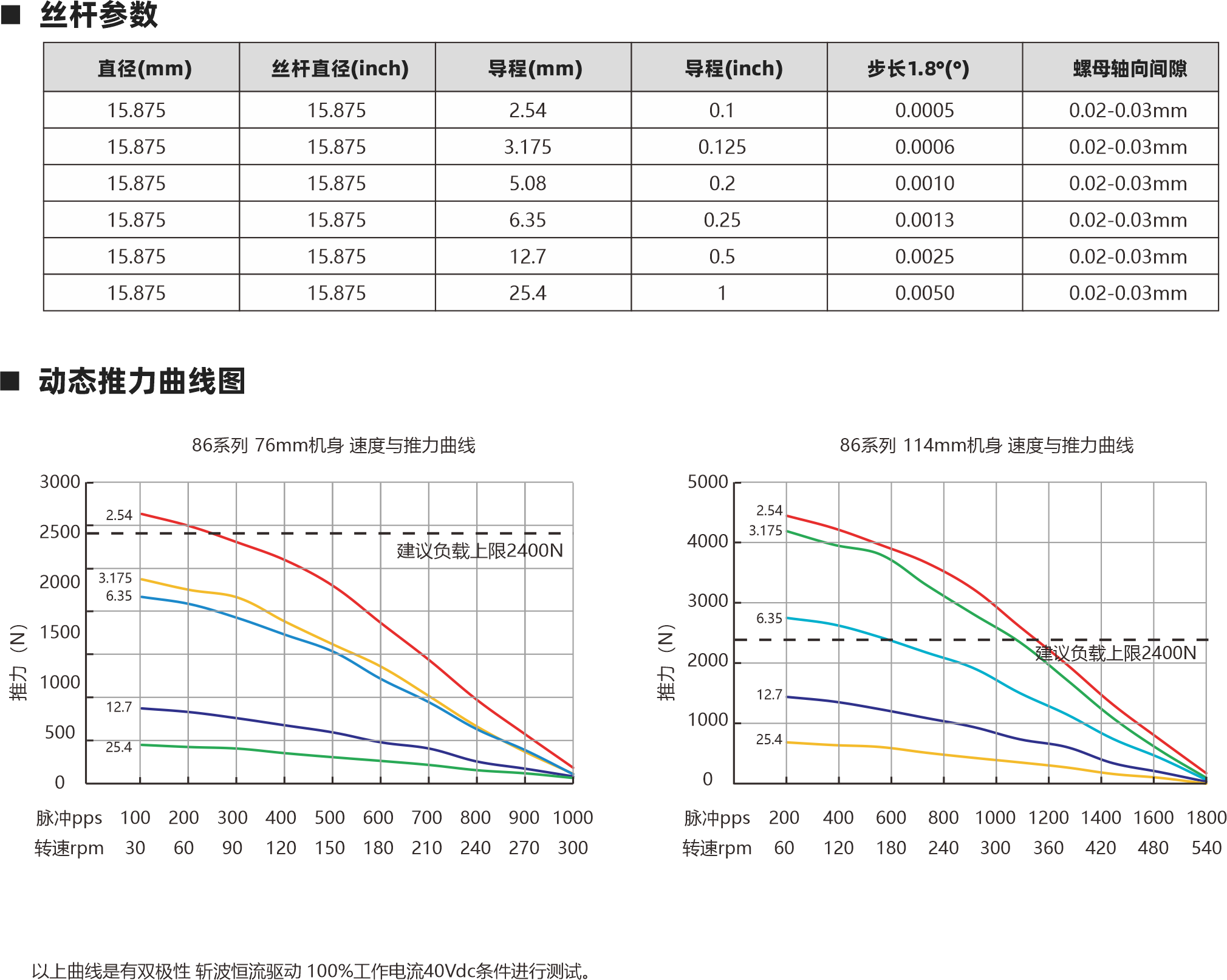 86 76mm 4.5 6A 0.5Ω 5.6mH 3V 114mm 8.5 6A 0.79Ω 10mH 4.74V 電機(jī)類型 機(jī)身L(mm) 保持力矩(N.m) 額定電流(A) 電阻(Ω) 額定電感(mH) 額定電壓(V) 15 16 86系列絲桿電機(jī) 86系列絲桿電機(jī) 動態(tài)推力曲線圖 外形圖 相數(shù) 步距角精度 IP等級  認(rèn)證 絕緣等級 運行環(huán)境溫度 2 ±5% 40 RoHS CE ISO9001 B(130℃) -20℃~ +50℃ 螺母類型 電機(jī)參數(shù) 絲桿參數(shù) 15.875 2.54 0.1 0.0005 15.875 0.02-0.03mm 15.875 3.175 0.125 0.0006 15.875 0.02-0.03mm 15.875 5.08 0.2 0.0010 15.875 0.02-0.03mm 15.875 6.35 0.25 0.0013 15.875 0.02-0.03mm 15.875 12.7 0.5 0.0025 15.875 0.02-0.03mm 15.875 25.4 1 0.0050 15.875 0.02-0.03mm 絲桿直徑(inch) 直徑(mm) 導(dǎo)程(mm) 導(dǎo)程(inch) 步長1.8°(°) 螺母軸向間隙 外部驅(qū)動式電機(jī) 貫通軸式電機(jī) 三角形螺母 圓形螺母 150±1 L 高柔電纜線 1.5 86 69.6 M12X1.75 150±1 L 20 10 高柔電纜線 1.5 31.8 12.7 31.7 12.7 Φ57.15 Φ44.45 3-Φ7 86系列 114mm機(jī)身 速度與推力曲線 脈沖pps 轉(zhuǎn)速rpm 200 60 400 120 600 180 800 240 1000 300 1200 360 1400 420 1600 480 1800 540 5000 4000 3000 2000 1000 0 2.54 6.35 3.175 12.7 25.4 86系列 76mm機(jī)身 速度與推力曲線 脈沖pps 轉(zhuǎn)速rpm 100 30 200 60 300 90 400 120 500 150 600 180 700 210 800 240 1000 300 900 270 3000 2500 2000 1500 1000 500 0 2.54 3.175 6.35 12.7 25.4 建議負(fù)載上限2400N 建議負(fù)載上限2400N 步進(jìn)直線傳動產(chǎn)品制造商 Linear stepper motor provider 步進(jìn)直線傳動產(chǎn)品制造商 Linear stepper motor provider 以上曲線是有雙極性 斬波恒流驅(qū)動 100%工作電流40Vdc條件進(jìn)行測試。 3-Φ7 4-Φ6.6 500±20 0 Φ73- 0.05 500±20 0 Φ73- 0.05 Φ28.6 19 Φ44.45 Φ57 Φ28.6 推力(N) 推力(N) 混合式絲桿步進(jìn)電機(jī) 混合式絲桿步進(jìn)電機(jī)