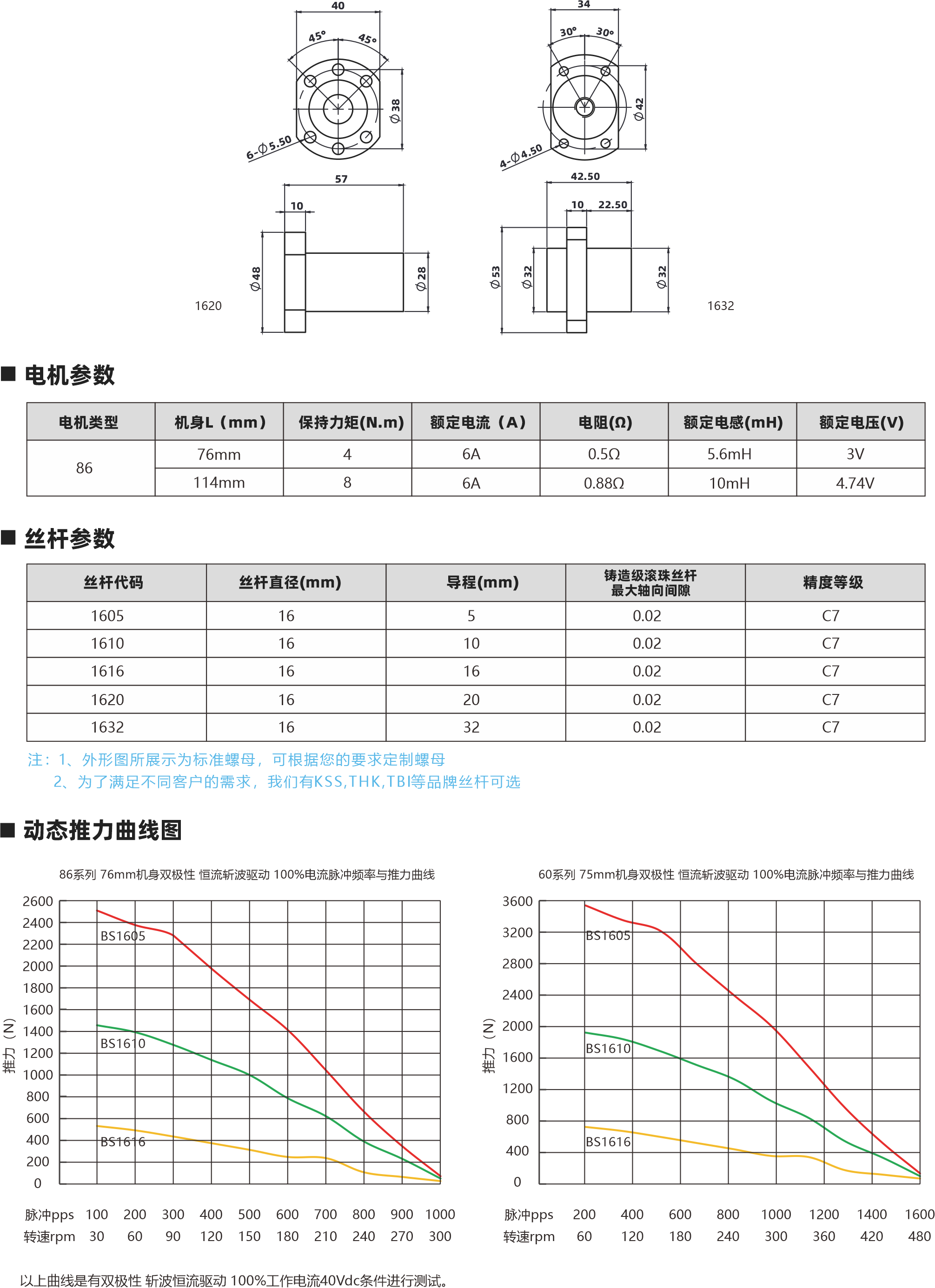 86系列滾珠絲桿電機(jī) 相數(shù) 步距角精度 IP等級 認(rèn)證 絕緣等級 運(yùn)行環(huán)境溫度 0 土5% 40 ROHS CE ISO9001 B( 130C) -20C- +50C 外形圖 69.6 4 J 5m ELo 02+005 螺母外形圖 60 配西 6 C0 50 1510 1621 1532 電機(jī)參數(shù) 電機(jī)類型 86 機(jī)身L(mm) 76mm 11 4mm 保持力矩(N.m) 額定電流(A] 64 64 電阻(Q] 0.50 0.880 額定電感(mH) 5.6mH 10mH 額定電壓IV) 3V 4.74V 絲桿參數(shù) 絲桿代碼 1605 1610 1616 1620 1632 絲桿直徑(mm) 16 16 16 分 16 導(dǎo)程(mm) 5 10 16 20 32 鑄適級滾珠絲桿最大軸向間陳 0.02 0.02 0邪伴毖2 0.02 0.02 精度等級 C7 C7 C7 0 C7 注: 1、外形圖所展示為標(biāo)準(zhǔn)螺母,可根據(jù)您的要求定制螺母 2、為了滿足不同客戶的需求,我們有KSS,THK,TBI等品牌絲桿可選 動態(tài)推力曲線圖 86系列 76mm機(jī)身雙極性 屆流新法這動 100%電流練沖數(shù)平與推力曲錢 2600240022002000180016001400120070008006004000 (N)長料 351670 240 270 300 wtpps 100 200 300 400 500 600 700 800 900 1000 專電rpm 30  60  90 120 150 180 210 0系列 75mm機(jī)身雙極性 信在新被這動 100%電流隊沖頻平與推力曲法 3600 320028002400200076007200800400O 脈沖pps轉(zhuǎn)迪rppm 851605 351610 351616 20060 400120 600 180 800 1000 1200 1400 240 300 360 420 1600480 以上曲線是有雙極性 斬波恒流驅(qū)動 100%工作電流40Vd親件進(jìn)行測試