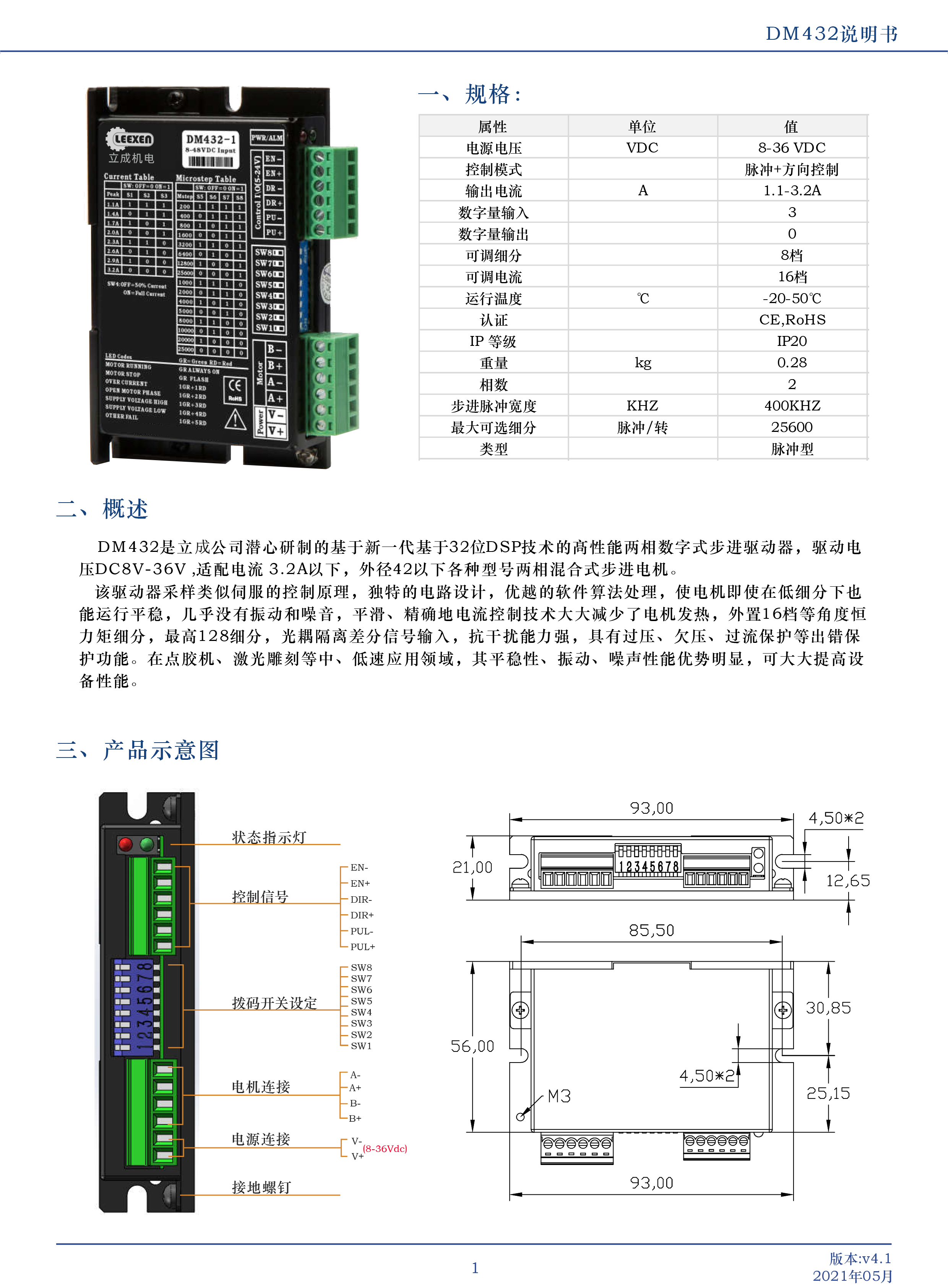 DM432是立成公司潛心研制的基于新一代基于32位DSP技術(shù)的高性能兩相數(shù)字式步進(jìn)驅(qū)動(dòng)器,驅(qū)動(dòng)電壓DC8V-36V適配電流 32A以下,外徑42以下各種號(hào)兩相混合式步進(jìn)電機(jī)該驅(qū)動(dòng)器采樣類似伺服的控制原理,獨(dú)特的電路設(shè)計(jì),優(yōu)越的軟件算法處理,使電機(jī)即使在低細(xì)分下也能運(yùn)行平穩(wěn),幾乎沒(méi)有振動(dòng)和噪音,平滑、精確地電流控制技術(shù)大大減少了電機(jī)發(fā)熱,外置16檔等角度恒力矩細(xì)分,最高128細(xì)分,光耦隔離差分信號(hào)輸入,抗干擾能力強(qiáng),具有過(guò)壓、欠壓、過(guò)流保護(hù)等出錯(cuò)保護(hù)功能。在點(diǎn)膠機(jī)、激光雕刻等中、低速應(yīng)用領(lǐng)域,其平穩(wěn)性、振動(dòng)、噪聲性能優(yōu)勢(shì)明顯,可大大提高設(shè)備性能。
