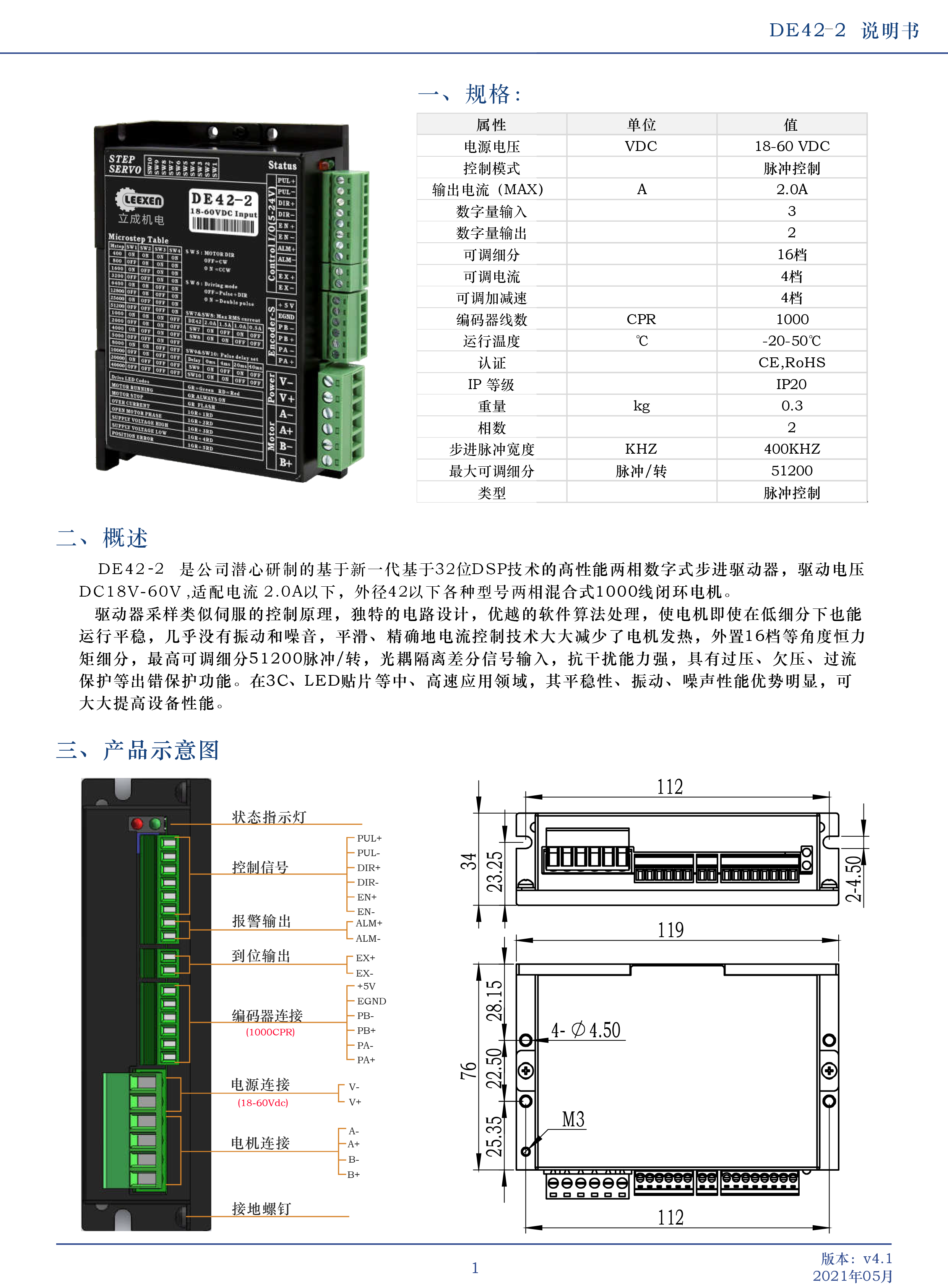 DE42-2 是公司潛心研制的基于新一代基于32位DSP技術(shù)的高性能兩相數(shù)字式步進驅(qū)動器,驅(qū)動電壓DC18V-60V適配電流 2.0A以下,外徑42以下各種型號兩相混合式1000線閉環(huán)電機。驅(qū)動器采樣類似伺服的控制原理,獨特的電路設(shè)計,優(yōu)越的軟件算法處理,使電機即使在低細分下也能運行平穩(wěn),幾乎沒有振動和噪音,平滑、精確地電流控制技術(shù)大大減少了電機發(fā)熱,外置16檔等角度恒力矩細分,最高可調(diào)細分51200脈沖/轉(zhuǎn),光耦隔離差分信號輸入,抗干擾能力強,具有過壓、欠壓、過流保護等出錯保護功能。在3C、LED貼片等中、高速應(yīng)用領(lǐng)域,其平穩(wěn)性、振動、噪聲性能優(yōu)勢明顯,可大大提高設(shè)備性能。